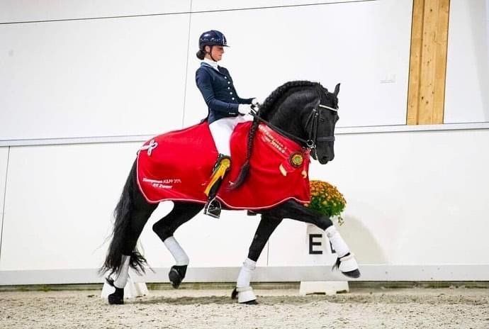 In 2016, I joined Ted Kop Jansen as a stable and competition rider, specializing in Friesian horses, where my appreciation for this breed blossomed. While working with Ted, I successfully competed several Friesian horses up till the medium tour, often achieving scores exceeding 70%. A highlight of my career was winning the European Championship with Kop Jansen Johnny Cash in 2019.